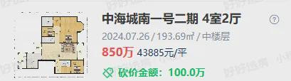 去年4月,中海城南一号二期成交了一套193㎡套四,成交总价852万,成交单价44013元/㎡。