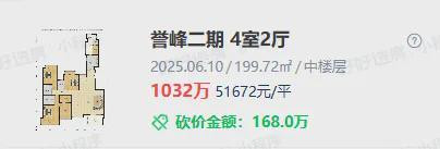 同板块的誉峰也难以支撑,今年6月,誉峰二期成交了一套199㎡的套四,成交总价1032万,成交单价51672元/㎡;