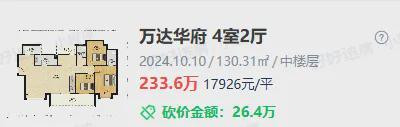 去年10月,万达华府成交了一套130㎡的套四,成交总价233万,成交单价17926元/㎡。